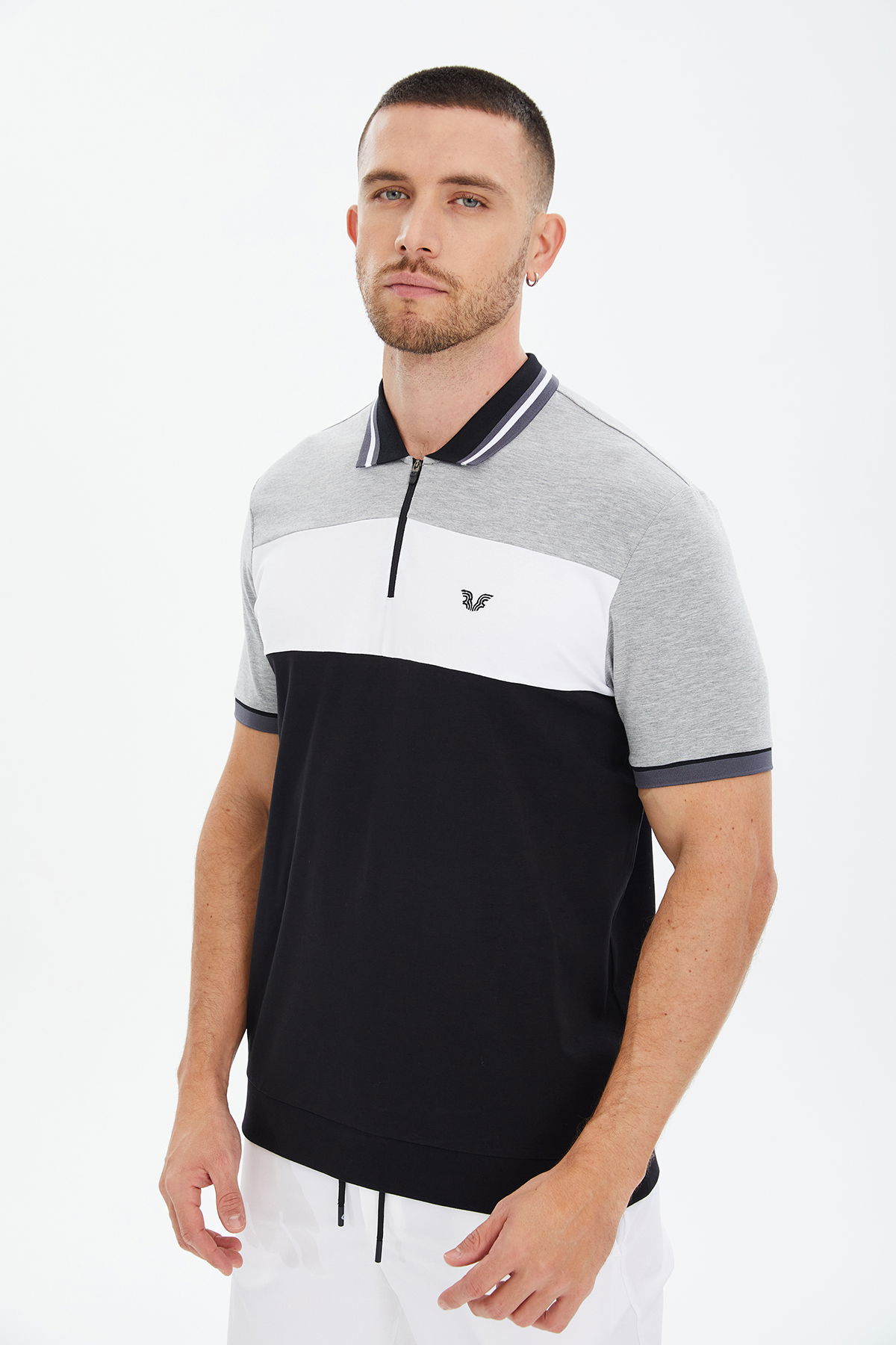 Erkek Siyah Gri Likralı Pamuklu Fermuarlı Polo Tişört | 0778
