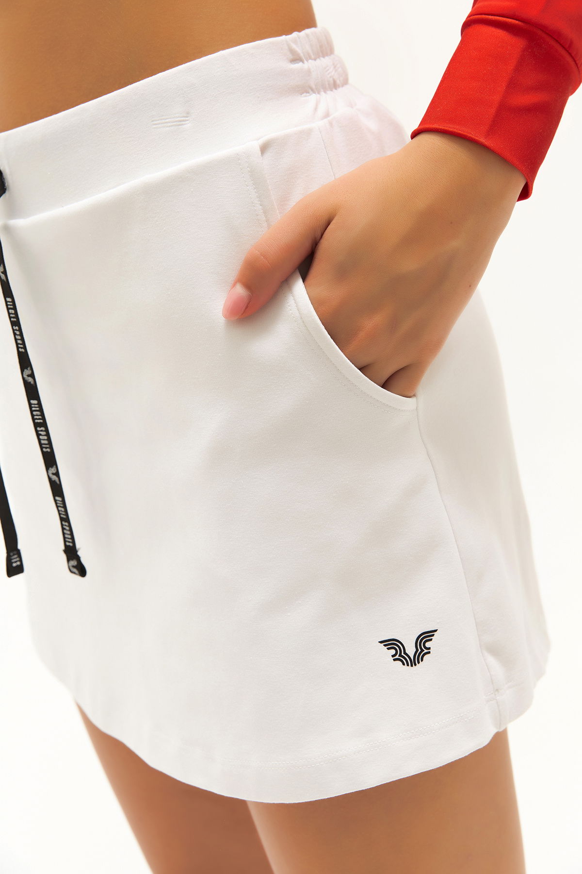 Vücudunuzla birlikte hareket etmek ve esnemek için tasarlanmış pamuklu şort etek lastik bel bandı ve kordon sayesinde giysi bedenine tam oturur.